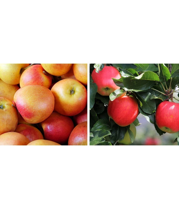 Manche neuen Züchtungen punkten mit so vielen Vorzügen, dass sie den alten, traditionsreichen Sorten echte Konkurrenz machen. Der Winterapfel ‘Topaz‘ ist eine Züchtung aus Tschechien, die erst seit 1984 auf dem Markt ist, inzwischen aber viele Apfel-Gourmets mit ihrem köstlichen, süß-säuerlichen Aroma überzeugt hat. Die Äpfel können ab September/Oktober gepflückt werden, sind ab Dezember genussreif und unter guten Bedingungen bis weit ins nächste Jahr lagerfähig. Die Sorte ‘Pinova‘ ist eine Dresdner Züchtung, die sich ebenfalls schnell durchgesetzt hat, im Profi-Bereich wie bei Hobby-Gärtnern. Die saftigen Früchte sind sehr schmackhaft und ebenfalls sehr lange lagerfähig. Beide Sorten sind unkompliziert zu kultivieren und sichern gute Erträge. Und jetzt kommt das Beste: Beide Sorten können Sie jetzt hier bei Dehner als Apfel-Duo ‘Topaz‘/‘Pinova‘ auf einem Stamm bekommen! Duo-Apfelbäume sind eine tolle Sache, um auch in kleineren Gärten mehrere Apfelsorten ziehen zu können.