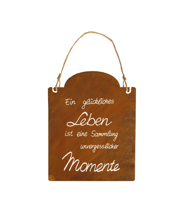Sie wollen Ihre Gäste im Garten mit einem positiven Spruch überraschen? Dann sichern Sie sich die Metall-Tafel Momente! Sie überzeugt sofort mit ihrer Rost-Optik, die ihrem Look das gewisse Extra verleiht. Ergänzt wird dieses Design mit wunderschönen Ornamenten, die perfekt zu der schönen Schriftart des Sinnspruches auf der Metall-Platte passen. Sicher werden Sie sich immer wieder besinnen, tief durchatmen oder einfach nur schmunzeln, wenn Sie diese tiefgründigen Worte im Garten erblicken. Damit Sie dieser Anblick rasch erfreut, können Sie die Tafel ganz unkompliziert an ihrem Henkel aufhängen. Egal, ob im Eingangsbereich, im Flur oder an der Terrassenwand, dieses schöne Accessoire wird Sie an vielen Ort begeistern!