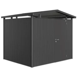 Das Gerätehaus von Biohort wurde aus feuerverzinktem, polyamid-einbrennlackiertem Stahlblech hergestellt und mit Schrauben sowie Scharnieren aus Edelstahl versehen. Dadurch verspricht es Ihnen eine lange Haltbarkeit. Es wartet außerdem mit einer hohen Stabilität bei Sturm auf und hält darüber hinaus normalen Schneelasten stand. Sie werden die Dachrinne auf beiden Seiten zu schätzen wissen, die mit einem Anschluss für ein gängiges Schlauchformat bestückt ist. Zusätzlich haben Sie 20 Jahre Garantie – bestellen Sie deshalb jetzt das Biohort Metallgerätehaus!
