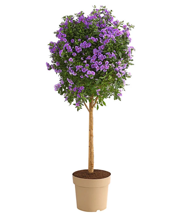 Die Farbe Blau hat die Menschen seit jeher fasziniert. Bei den Ägyptern war es die Farbe der Götter, in der modernen Farblehre wirkt Blau beruhigend und versetzt uns in einen entspannten Zustand des Träumens. Und jeder, der sich schon einmal in die extrem farbintensiven Blüten einer Enzianpflanze versenken durfte, wird sofort begeistert zustimmen. Auch wenn die sternförmigen Blüten in einem ähnlichen Blauton strahlen, ist der Blaue Enzianstrauch nicht mit dem bei uns heimischen Alpen-Enzian verwandt, er stammt aus Südamerika. Er gehört, ebenso wie die Kartoffel, zur Familie der Nachtschattengewächse und ist auch unter dem profanen Namen Kartoffelstrauch bekannt. Mit dem Blauen Enzian zieht ein farbstarker Dauerblüher auf dem Balkon oder der Terrasse ein, der Sie von April bis Oktober mit seinem Blütenzauber zum Träumen bringen wird!