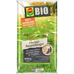 Der auf Mikroorganismen basierende COMPO BIO Herbst-Rasendünger schafft Abhilfe, wenn Rasen und Pflanzen schlecht wachsen und lässt sie gesund aussehen. Er sorgt dafür, dass die Erde sich selbst reinigt und wieder locker und mit Sauerstoff angereichert die Wurzeln umgibt. Wie ein belebendes Tonikum verbessert der COMPO BIO Herbst-Rasendünger mit lebenden Mikroorganismen die Widerstandsfähigkeit Ihrer Pflanzen. Er tötet schädliche Keime, Pilze und Bakterien und haucht verbrauchter Erde neues Leben ein. Sie können den organischen NPK-Dünger, der sich auch für den ökologischen Landbau eignet, mit einem Streuwagen in die Erde einbringen. Entscheiden Sie sich jetzt für gesunde, widerstandsfähige Pflanzen und nährstoffreichen Boden mit dem COMPO BIO Herbst-Rasendünger!