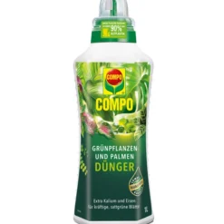 Sie wollen sich die Versorgung Ihrer Pflanzen mit wichtigen Nährstoffen extra leicht machen? Dann verlassen Sie sich auf den flüssigen Grünpflanzen- und Palmendünger der Firma COMPO! Diesen mineralischen Spezialdünger können Sie für alle Grünpflanzen und Palmen im Zimmer, auf dem Balkon und auf der Terrasse nutzen. Er stärkt die Widerstandskraft Ihrer Grünlinge und stimuliert das Wurzelwachstum, sodass Sie sich rasch an kräftigerem Blattgrün und vitaleren Gewächsen erfreuen können. Sie werden mit einem positiven Gefühl auf Ihre gesunden und kräftigen Pflanzen schauen und froh sein, dass deren Nährstoffversorgung dank dieses sofort wirksamen und chloridarmen Düngers so einfach geht.