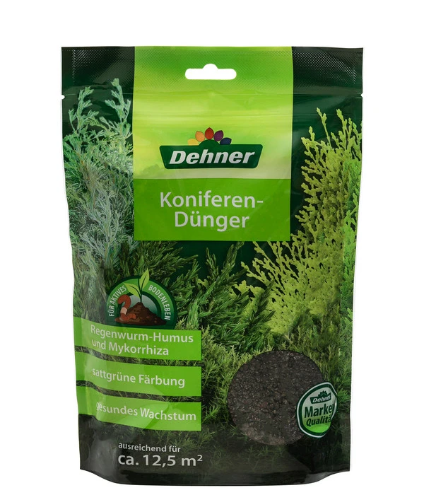 Koniferen gehören seit langem zu den beliebtesten Pflanzen in unseren Gärten. Meist immergrün, unkompliziert und frostfest machen sie fast alles mit, was der Gärtner mit ihnen vorhat. Vielleicht haben auch Sie einen prachtvollen Solist im Beet, eine blickdichte Hecke um das Grundstück oder kleine, grüne Kissen im Kübel auf der Terrasse? Dann behalten Sie Ihre grünen Schätze gut im Auge und achten Sie darauf, ihnen alles zu geben, was sie brauchen. Mit dem Dehner Koniferen-Dünger haben Sie einen hochwertigen, organisch-mineralischen Volldünger zur Hand. Die Hauptnährstoffe • Stickstoff, • Phosphor und • Kalium sind in der speziell auf Immergrüne zugeschnittenen Mixtur von 9+4+8 enthalten. Doch der Dehner Koniferen-Dünger enthält noch zwei ‘Schmankerl‘, die Ihren Koniferen besonders gut schmecken werden: Regenwurmhumus und Mykorrhiza.