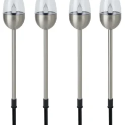 Die traditionelle Fackelform wurde modern interpretiert, die funktionalen Materialien sind State of the Art und der Flackereffekt verbreitet die romantische Stimmung echten Kerzenscheins – mit der Dehner Solar-Edelstahlleuchte entscheiden Sie sich für eine ganz besondere Außenleuchte. Oder besser gesagt für vier, denn die Gartenleuchte gibt’s jetzt im praktischen 4er-Set. Damit eröffnen sich Ihnen eine Vielzahl von interessanten Deko-Möglichkeiten. Sie können die knapp 50 cm hohen Edelstahl-Leuchten zum Beispiel als Quartett neben der Terrasse platzieren und dort bei Ihren entspannten Stunden am Abend den romantischen Flackereffekt des „Kerzenscheins“ genießen, Sie können die vier Solarlampen aber auch im Garten verteilen: eine neben der Terrasse, eine zwischen blühende Büsche, eine neben die Kletterrose – ganz wie es am besten zu Ihrer Gartenanlage passt. Seien Sie clever und setzen Sie bei der Außenbeleuchtung auf Solarleuchten, dann haben Sie bei der Wahl des Standorts (fast) freie Wahl! Die Dehner Solar-Edelstahlleuchte muss sich allerdings tagsüber sonnen dürfen…