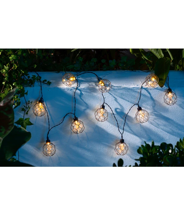 Sie verzaubern Ihre Gäste gern bei Ihren Gartenpartys mit ganz besonderen Dekoideen? Dann ist die Solar-Lichterkette ‚Granada‘ von Dehner genau das Richtige für Sie! Das schicke Dekoelement überzeugt mit seinem einzigartigen Design, das wirklich jedem ins Auge sticht. Die metallene Netzstruktur um die Leuchtkugeln sorgt für einen angesagten Vintage-Look, der jeder Grillfeier und Geburtstagsparty das besondere Extra verleiht. Genießen Sie die ausgelassene Stimmung auf Ihrem Event, denn um das Einschalten der Lichterkette müssen Sie sich nicht kümmern. Sie erstrahlt automatisch bei Dämmerung und leuchtet bis zu sechs Stunden, um Ihre gemütliche Runde mit einem zarten, warmweißen und romantischen Licht zu begeistern.