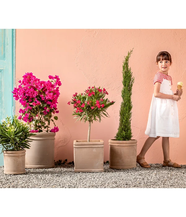 Wohl kaum eine andere Pflanze erinnert so sehr an Urlaub in südlichen Gefilden wie die Bougainvillee. Mit ihren kleinen, weißen Blüten und deren typischen ‚Halskrause‘ aus kräftig gefärbten Hochblättern, zaubert sie im Nu mediterranes Flair auf Balkon und Terrasse. Die Farbenpracht der Drillingsblume, wie sie aufgrund ihrer Blütenform auch genannt wird, zeichnet sich durch die kräftigen pink-violetten Hochblätter aus. Hinter unseren Bougainvilleen steckt die Sorte ‚Sanderiana‘, die eine besondere Leuchtkraft und lang anhaltende Blüte verspricht. Da die Bougainvillee in Brasilien beheimatet ist, bevorzugt sie auch bei uns einen vollsonnigen und warmen Standort, wenn Sie ihr diesen Wunsch erfüllen, taucht die Drillingsblume Ihr Zuhause in ein Meer aus Blüten.