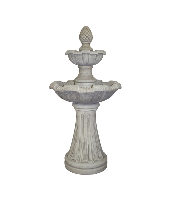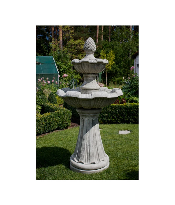 Seit der Renaissance sind kunstvoll gestaltete Springbrunnen Teil der Gartenkunst, deren berühmteste Beispiele in vielen Parkanlagen nobler Palazzi rund ums Mittelmeer auch jetzt noch ihr einzigartiges Flair verbreiten. Diesen klassischen Vorbildern nachempfunden ist der fantasieco Steinbrunnen Pisa. Auch beim fantasieco Steinbrunnen Pisa ruhen auf einer eleganten, sich nach oben verjüngenden Säule zwei kunstvoll gearbeitete Wasserschalen, gekrönt von einem Wasserspeier in Form eines wunderschön stilisierten Pinienzapfens dem Symbol der Fruchtbarkeit, des Lebens und des Reichtums. Seit der Römerzeit sind aus Stein gefertigte Pinienzapfen bekannt, die wie beim fantasieco Steinbrunnen Pisa aus vielen Bohrungen kleine Wasserstrahlen in die darunter befindlichen Schalen plätschern lassen. Der fantasieco Steinbrunnen Pisa ist ein Gartenkunstwerk von beeindruckender Schönheit, das Ihr Gartenambiente mit seiner mediterranen Ausstrahlung prägen wird.