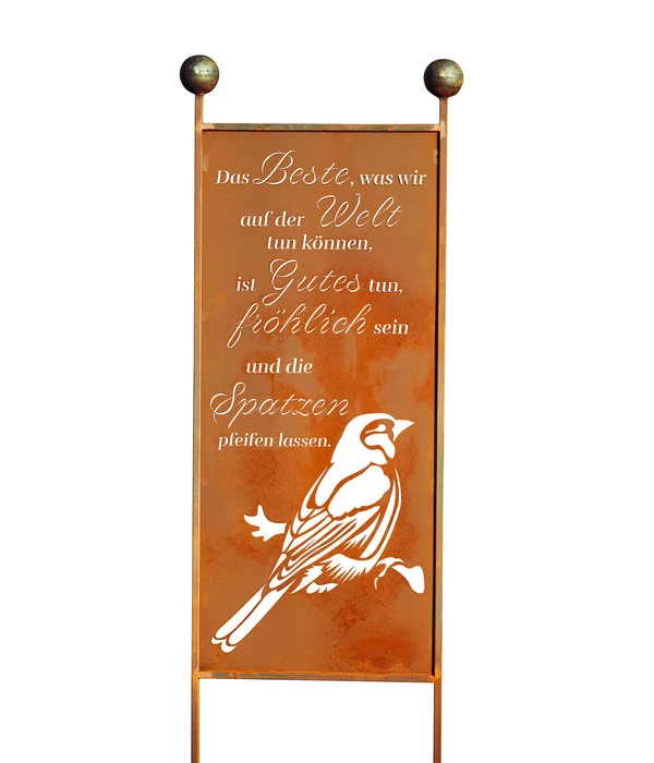 Sie möchten Ihr grünes Refugium mit tollen Deko-Elementen schmücken und auf diese Weise optisch reizvolle Akzente setzen? Dabei hilft Ihnen der hochwertige Ferrum Metall-Gartenstecker Spatz, dessen wunderbare Edelrostoptik eine harmonische Verbindung zu den verschiedenen Grün- und Brauntönen des Außenbereichs eingeht. Ein in schöner Typografie eingearbeiteter, inspirierender und zum Nachdenken anregender Spruch des italienischen Priesters Giovanni Bosco ziert das dekorative Element. Die Worte werden von einem filigran gestalteten, bezaubernden Spatzen motivisch aufgegriffen. Gartenfreunde mit einem ausgeprägten Sinn für Ästhetik treffen mit dem Ferrum Metall-Gartenstecker Spatz eine hervorragende Wahl. Auch als Geschenk ist das Ornament bestens geeignet.