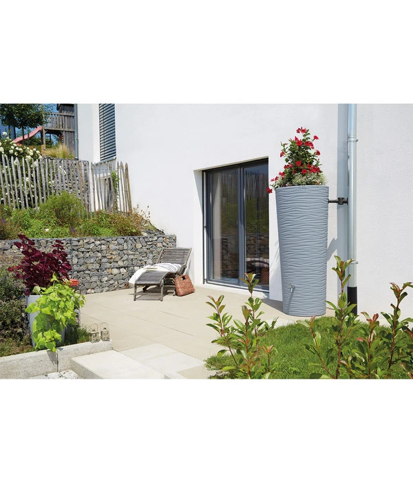 Der Garantia Natura 2in1 Regenspeicher ist von einzigartig dekorativer Wirkung! Ja, man darf wirklich etwas überschwänglich werden, wenn man über die raffiniert wellenförmige Oberflächenstruktur des Garantia Natura 2in1 Regenspeicher spricht, die auf jeder Terrasse die Blicke auf sich ziehen wird. Denn wenn Sie und Ihre Gäste sich mehrere Stunden auf der Terrasse aufhalten, während sich der Sonnenstand ändert oder die Dämmerung hereinbricht, wird Sie der Garantia Natura 2in1 Regenspeicher je nach Lichteinfall mit immer neuen Kontrasten und Farbspielen überraschen. Neben diesem faszinierenden Schauspiel bietet der Garantia Natura 2in1 Regenspeicher außerdem den Anblick eines modern designten, imposanten Pflanzkübels, im dem prächtige Sommerblumen oder Immergrün wachsen, ganz nach Ihrem Geschmack. Der Garantia Natura 2in1 Regenspeicher hat nämlich eine 20 cm tiefe Pflanzschale, die sich auch wunderbar leicht herausnehmen lässt und Ihnen viele Möglichkeiten zur individuellen Bepflanzung eröffnet.