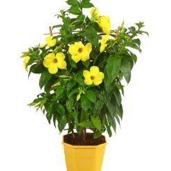 Ihre Fans sind sich einig: Die Goldtrompete ist eine der schönsten Kletterpflanzen und macht der bekannteren Dipladenie, der sie ein wenig ähnelt, echte Konkurrenz. Im Gegensatz zur Dipladenie schmückt sich die Allamanda cathartica mit sonnengelben, trompetenartigen Blüten, die im Sommer über dem glänzenden, sattgrünen Laub leuchten. Was muss das erst für ein fantastischer Anblick sein, wenn man die Pflanze am Naturstandort in den undurchdringlichen Regenwäldern Brasilien entdeckt, wo die zahlreichen Blüten in dem Halbdunkel besonders hell leuchten! Aber auch in unseren Wohnungen hier in Mitteleuropa ist die Goldtrompete ein Blickmagnet im Raum. Vor allem, weil sie nicht nur eine ungebremste Blühfreude zeigt, sondern auch vor Wachstumsenergie nur so sprüht und in Windeseile an einem Spalier oder einer anderen Kletterhilfe bis in Höhen von 200 cm klettert. Gönnen auch Sie sich den Anblick dieser traumhaft schönen Tropenpflanze, die auch unter dem Namen Dschungelglocke bekannt ist.