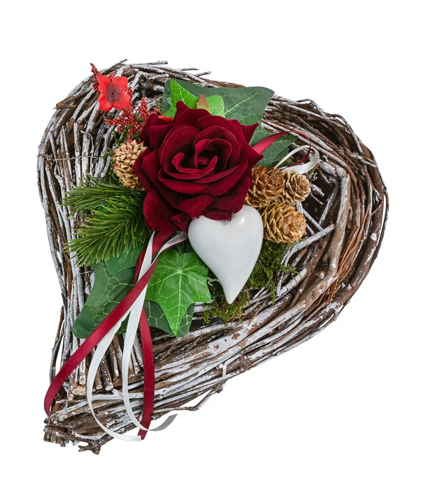 Sie möchten die Grabstätte Ihrer Lieben zu einem Feiertag wie Allerseelen mit einem geschmackvollen Gesteck schmücken? Dann treffen Sie mit dem herzförmigen Grabgesteck Bristol eine ausgezeichnete Wahl. Es besteht aus Rebenzweigen bestückt mit hübschen Details, beispielsweise einer Seidenrose, künstlichen Zweigen und Efeu. Besondere Akzente setzt die moderne Whitewash-Optik, die gut in die winterliche Zeit passt. Mithilfe der liebevoll gestalteten floristischen Dekoration signalisieren Sie, dass Sie an Ihren geliebten Verstorbenen denken und ihn nicht vergessen werden. Neben der symbolischen Bedeutung trägt das Grabgesteck Bristol auch zu einer optischen Aufwertung der Ruhestätte bei.