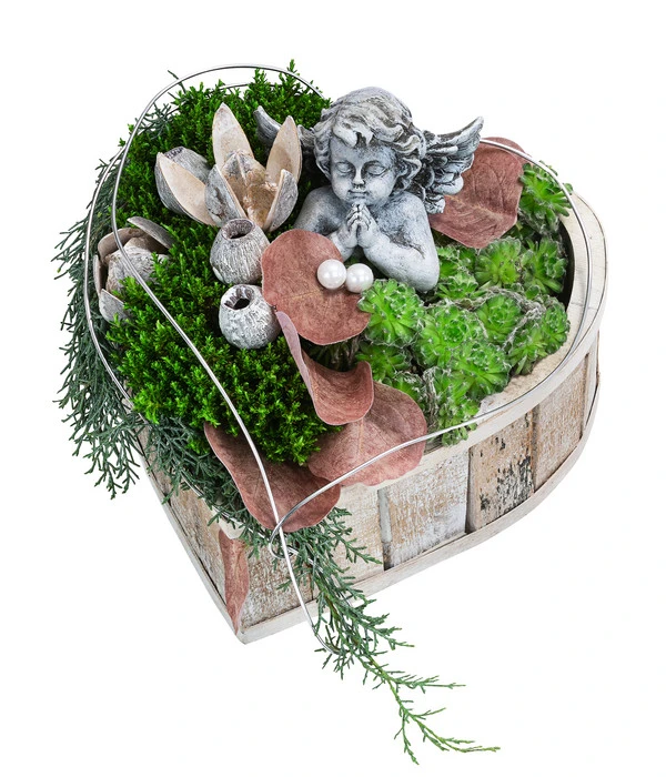 Das Grab eines geliebten Menschen zu schmücken, sodass die immerwährende Zuneigung sichtbar zum Ausdruck kommt, ist nicht immer einfach. Mit Symbolen wie Herzen oder Engeln können Sie aber stilvoll ausdrücken, wie verbunden Sie sich den Verstorbenen noch fühlen. Das Grabgesteck Im Himmel eignet sich wunderbar für Anlässe wie Allerheiligen, Allerseelen oder den Totensonntag, aber auch für den Todestag oder den winterlichen Grabschmuck. Es besteht aus einer geweißten Holzschale, liebevoll in Herzform gebracht und mit Pflanzen, Holzblüten und einer kleinen Engelsfigur dekoriert. Der betende Polyresin-Engel wird fortan über das Grab wachen, wenn Sie nicht selbst zugegen sein können, und Trost spenden. Setzen Sie kleine Akzente an der letzten Ruhestätte mit symbolträchtigen Formen und Figuren.
