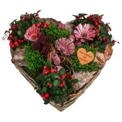 Für das Grabgesteck In Liebe wurde eine rustikale Rebenunterlage mit langehaltbaren Pflanzen wie Strauchveronika und Teppichbeere bepflanzt und mit prachtvollen Deko-Blüten geschmückt, die mit ihrem dezenten White-Washed-Finish wunderschön in die winterliche Jahreszeit passen. Als seien gerade die ersten Schneeflocken auf das Gesteck gefallen. Ein Arrangement, das schon dank der Herzform Ihre innigen Gefühle für die Toten ausdrückt. Doch damit nicht genug. Mit dem Grabgesteck in Liebe können Sie Ihren Lieben einen persönlichen Gruß in die Ewigkeit schicken – mit dem herzförmigen Metallschild und den Worten “Für immer im Herzen“.