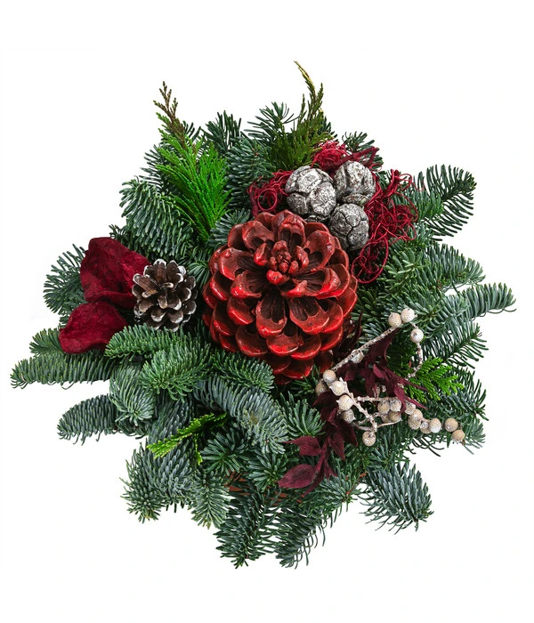 Gerade in Herbst und Winter schlägt das Wetter so manche Kapriolen. Nebel, Regen und Frost können dem Grabschmuck zusetzen und ihn schnell unansehnlich werden lassen. Für eine ansprechende Optik über Wochen haben erfahrene Floristen robuste Tannen- und Koniferenzweige samt haltbaren Naturmaterialien in einer wetterfesten Tonschale platziert. Ein großer, gewachster Zapfen ist das Highlight des Arrangements und verleiht ihm eine dezente, aber dennoch elegante Note. Schmücken Sie das Grab Ihrer Verstorbenen mit dem Grabgesteck in praktischer Terrakotta-Schale und erfreuen Sie sich bis zum Frühling hinein an seiner schlichten Schönheit.
