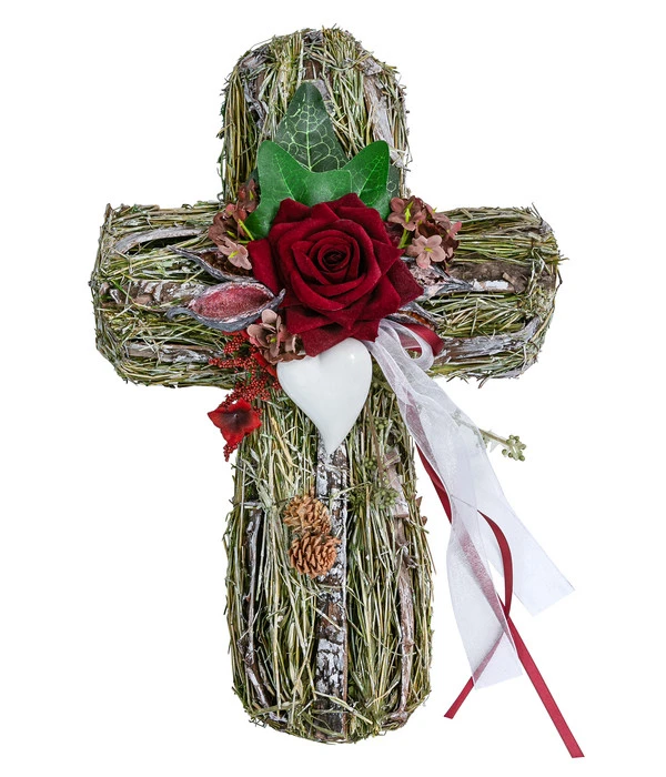 Das Grabgesteck Perth in Form eines Kreuzes ist eine geschmackvolle Wahl für kleine Grabstätten und Urnengräber. Die rote Seidenrose steht für die tiefe Verbundenheit und erinnert an die kostbaren Momente, die Sie mit Ihrem geliebten Menschen geteilt haben. Eine Unterlage aus Heu und Rindenstücken verleiht dem Gesteck eine natürliche Note, während der immergrüne Efeu Hoffnung symbolisiert. Das weiße Keramikherz setzt einen Kontrast zur roten Seidenrose und schenkt dem Gesteck eine besondere Ausstrahlung. Ergänzt wird das Arrangement durch eine Brachicyton-Schote in Rot, künstliche rote Beeren und eine zarte Hortensienblüte in Rosa. Verschiedene natürliche Zapfen sowie rote und weiße Seidenbänder vervollständigen das Ensemble.