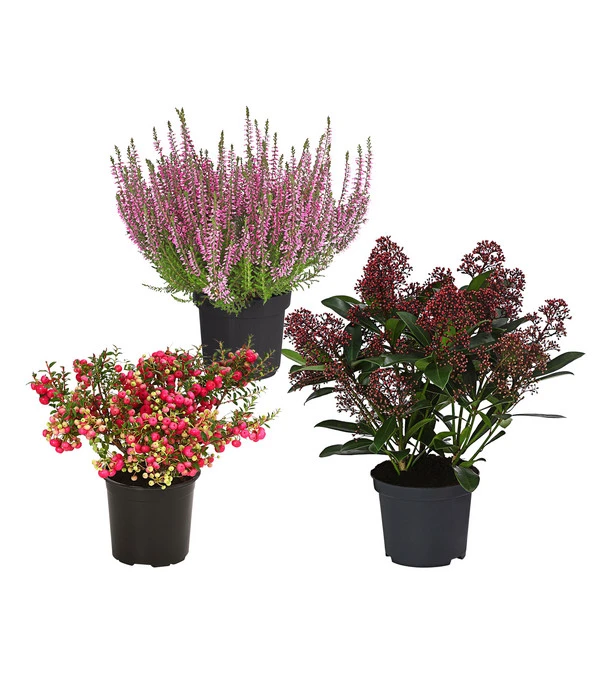 Rot, die Farbe der Liebe, hat unendlich viele Facetten. Eine wunderbare Farbe also, wenn es um den Pflanzenschmuck für die letzte Ruhestätte unserer lieben Verstorbenen geht. Wählen Sie deshalb unbedingt das Grabpflanzenset Im Herzen. Denn jedes einzelne davon schmückt sich mit einem anderen Rotton. Während die Skimmie ‚Rubella‘ stolz ihre dunkelroten Blütenknospen über dem glänzend grünen Laub präsentiert, reiht die Knospenheide unzählige kleine Blüten in zartem Rosa an ihren aufwärtsstrebenden immergrünen Trieben auf und sitzen dicht an dicht pralle, rosafarbene Beeren an den Zweigen der Torfmyrte. Ein abwechslungsreiches Ensemble also, das auf stilvolle Weise Farbakzente auf das Grab zaubert. Nicht ohne Grund zählen diese attraktiven Gewächse seit langem zu den beliebtesten Klassikern und sind Jahr für Jahr wieder auf vielen liebevoll gestalteten Gräbern zu sehen. Die immergrünen Pflanzen aus dem Grabpflanzenset Im Herzen eignen sich hervorragend, um der Grabstätte Ihres lieben Verstorbenen einen dekorativen Herbst- und Winterschmuck zu verleihen, greifen Sie also zu und pflanzen diese geschmackvollen Farbakzente nach Ihrem Geschmack ein!