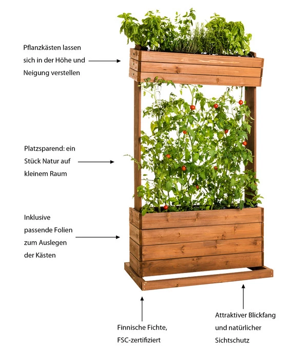 Wenn es ums moderne Gärtnern geht, ist das Thema Hochbeete in aller Munde. Und dieser Trend kommt nicht von ungefähr. Denn mit einer Anschaffung wie dem Hecht Hochbeet Cube 2 kann sich jeder ein üppig begrüntes Nutzbeet im Miniformat einrichten. Ganz gleich, ob es im Garten, auf der Dachterrasse mitten in der Stadt oder auf dem Balkon steht. Mit seinen praktischen Maßen passt es überall hin. Und dennoch lässt sich eine ganze Menge hinein pflanzen. Aus massivem Holz gestaltet und in seiner natürlichen Färbung belassen, integriert sich das Hecht Hochbeet Cube 2 auch gut in jegliche Terrassen- oder Balkon-Einrichtung. Aber damit nicht genug. Denn Ihr neues praktisches Hochbeet Cube 2 von Hecht bietet noch eine zusätzliche Raffinesse: beide Kästen lassen sich in der Höhe verstellen und sogar neigen.