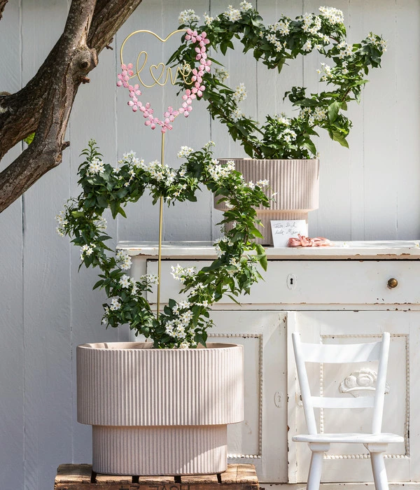Pflanzen wie der Jasminblütige Nachtschatten, auch Jasmin-Solanum genannt, erfreuen vor allem durch ihre prächtigen Blüten. Man muss nicht genauer Hinsehen um die Fontäne der Blütensterne zu sehen, die der Jasminblütige Nachtschatten versprüht, denn die kleinen, weißen Sternenblüten sitzen wie Trauben dicht nebeneinander. Die Kübelpflanze zeigt sich als dankbarer und wuchswilliger Kletter, da sie meterlange Triebe bildet, die sich auch wunderbar formen lassen. Deshalb wurden diese so geschickt geformt, dass durch den Trieben ein atemberaubendes Blütenherz entsteht. Übrigens: lassen Sie sich von dem Namen Jasmin nicht in die Irre führen. Der Jasminblütige Nachtschatten zählt zu den Nachtschattengewächsen und ist vielmehr mit der Kartoffel verwandt, als mit dem Echten Jasmin. Seinen Namen verdankt der Sommerblüher wohl aber dem Jasminum, aufgrund der großen Ähnlichkeit ihrer Blüten.