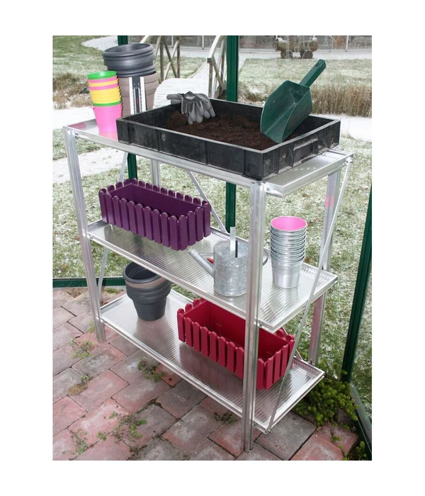 Als Hobbygärtner lieben Sie das selbst gezogene Gemüse aus dem eigenen Garten und sind stolzer Besitzer eines Gewächshauses von KGT, in dem Sie Ihre Pflanzen witterungsunabhängig kultivieren können? Der Spezialist für Gartengewächshäuser bietet Ihnen auch eine sinnvolle Auswahl an Zubehör an, unter anderem das freistehende KGT Universal Regalsystem. Größe, Design und Material sind perfekt auf alle Gartentreibhäuser der Marke KGT abgestimmt. Das ungeordnete Abstellen oder -legen von Kleingeräten, Pflanztöpfen oder Behältern mit Erde gehört nun der Vergangenheit an, denn das Universal Regalsystem ermöglicht die übersichtliche und platzsparende Aufbewahrung Ihrer Utensilien auf drei Ebenen. So behalten Sie immer den Überblick und alles hat seinen festen Platz. Zudem dient der obere Regalboden auch als Arbeitsplatte. Diese hat eine angenehme Höhe, sodass Sie hier rückenschonend und bequem hantieren können.
