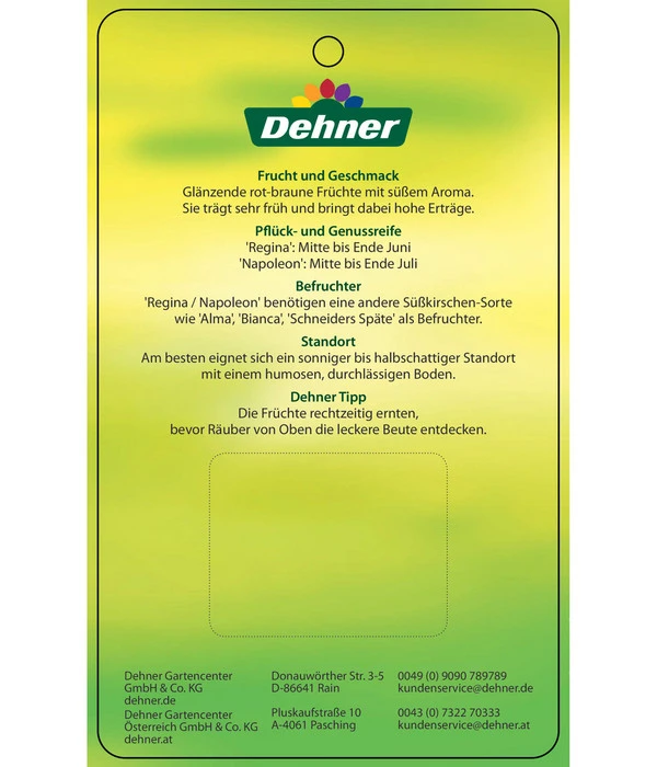 Wie alle anderen Süßkirschen bevorzugt auch dieser Duo-Baum einen sonnigen bis halbschattigen Standort. Der Boden sollte nährstoffreich, leicht und feucht sein. Hilfreich für ein gutes Gedeihen ist auch regelmäßiges Düngen, zum Beispiel mit Dehner Obstbaumdünger oder Hornspänen. Bis die Pflanze gut eingewurzelt ist, sollte sie regelmäßig gegossen werden, später sind Wassergaben nur noch in längeren Trockenperioden erforderlich. Die ‘Napoleon‘ ist ein guter Bestäuber für andere Kirschensorten, für sie selbst eignen sich als Befruchter die Sorten ‘Burlat‘, ‘Hedelfinger‘ oder ‘Schneiders Späte Korpelkirsche‘. Bei Regina handelt es sich ebenfalls um eine selbststerile Pflanze, für die sich als Befruchter unter anderem ebenfalls ‘Schneiders Späte‘ eignet. Oftmals ist es aber ausreichend, wenn ein Nachbar im Umkreis von 800 m einen Befruchterbaum stehen hat.