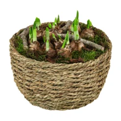 Der Frühling ist die Zeit der bunten Blumen, summenden Insekten und vor allem der guten Laune, wenn sich endlich die Sonne wieder zeigt. Was also könnte das Frühjahr besser repräsentieren als ein ganzer Korb voller Narzissen? Die strahlenden Blütenschönheiten gehören zu den beliebten Klassikern der Frühlings- und Osterdekoration und Sie können Sie jetzt ganz einfach in diesem schönen Seilkorb mit nach Hause nehmen. Eingepflanzt wurden hier ‚Tête à Tête‘ Narzissen, deren sonnengelbe Blüten vom ländlichen Charme des Korbes unterstrichen werden. Abgerundet wird das Arrangement mit Moos und Rinde als Abdeckung im Korb. So haben Sie direkt die perfekte Dekoration, ganz ohne lästiges Aussuchen, Einpflanzen und Dekorieren.