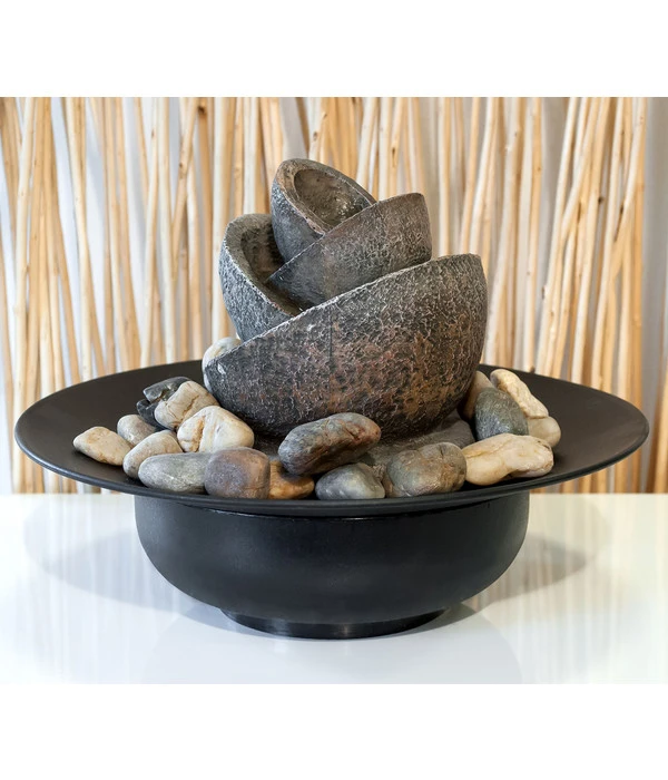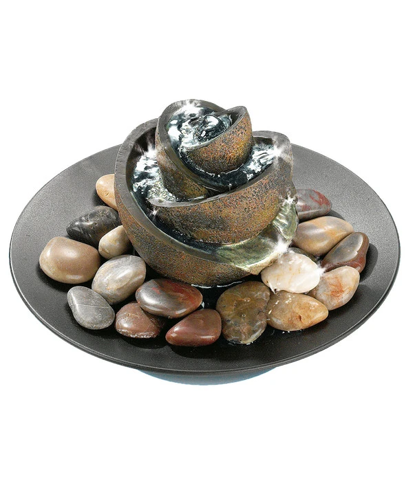 Sie sehnen sich nach innerer Ruhe? Nach einem Zufluchtsort, an welchem Sie neue Energie tanken und Kraft schöpfen können? Dann lassen Sie sich von unserem bildschönen Pajoma Zimmerbrunnen Flower mit seiner einzigartig und liebevoll gestalteten Blüte aus Kunstharz verzaubern. Leise und entspannend rieselt das Wasser über die kunstvollen Blütenblätter hinab auf die Naturkiesel, welche auf einer schwarzen Schale verteilt sind. Dieses traumhaft schöne Dekorationselement besteht aus bruchfestem Polyresin und ist eine Bereicherung für all Ihre Räume. Dank seines extra langen Stromkabels und seines geringen Gewichts lässt es sich überall platzieren – Ihrer Kreativität sind keine Grenzen gesetzt.