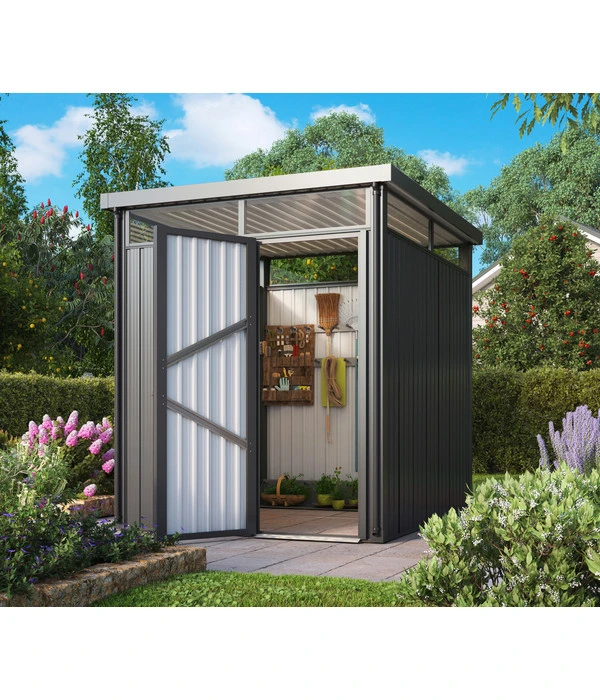 In dem geräumigen Pergart Metallgerätehaus Basel haben viele Ihrer Gartengeräte, Werkzeuge, Fahrräder, Poolspielzeuge und andere Utensilien ausreichend Platz. Das moderne Blechdesign mit feinen Rippen sorgt darüber hinaus für eine hohe Steifigkeit der Konstruktion, was gerade im Outdoorbereich sehr wichtig ist. Eine erstklassige Polyesterlackierung schützt die Außenwände, das Dach und die Bodenrahmenteile zudem optimal vor Rost und Kratzern. Sie können sich also auf ein hochwertiges und wetterfestes Produkt in Ihrem Garten freuen. Gönnen Sie sich diesen Komfort und machen Sie sich das Verstauen Ihrer Gartentools leichter, indem Sie das Metallgerätehaus Basel der Marke Pergart jetzt bestellen!