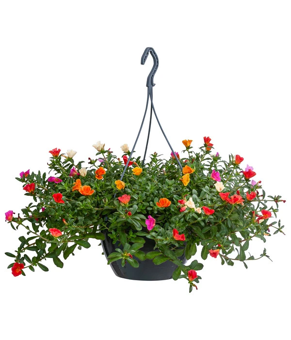 Damit Sie ohne eigene Pflanzaktion den Blütenzauber des Portulakröschens genießen können, haben wir die Pflanze bereits in eine Hängeampel gepflanzt. Denn mit ihrem niedrigen, nur 10-15 cm hohen Wuchs und den leicht überhängenden Trieben kann sich ihr Charme besonders schön in Ampeln und hohen Schalen entfalten. Gern wird die unkomplizierte Dauerblüherin an die Decke von Terrassen und Balkonen gehängt, ist Ihr Hauseingang sonnig, kann das Portuklakröschen aber auch dort farbenfrohe Sommerstimmung verbreiten.