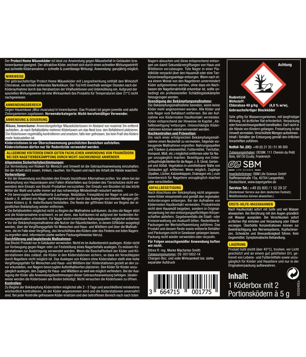 Sie erhalten mit PROTECT HOME Rodicum® Mäuse-Köder nicht nur den für Mäuse hochattraktiven Fraßköder, sondern im Lieferumfang ist zugleich eine passende Köderbox enthalten. Diese Box ist so konstruiert, dass zwar die Nager gut hineinschlüpfen können, um von dem Ködermaterial zu fressen, neugierige Haustiere und Kinderhände die Köderbox aber nicht öffnen können. Deshalb ist PROTECT HOME Rodicum® Mäuse Köder die richtige Wahl, wenn es in Ihrem Haushalt Kinder oder Haustiere gibt.