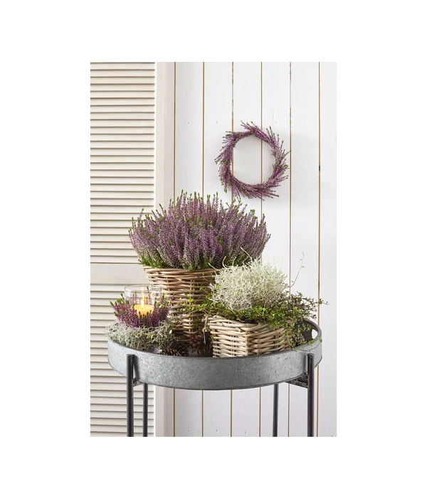 Einen besonders stimmigen Effekt erzielen Sie, wenn Sie in den rustikalen Rattan-Topf Blumen setzen, die ländlichen Charme versprühen. Das können im Frühling blaue Traubenhyazinthen oder Ranunkeln sein, die im Sommer von Schleierkraut oder Wolfsmilch abgelöst werden. Auch drei prächtige Sonnenblumen passen wunderbar zum Flair dieses Topfs. Im Herbst lassen Sie leuchtende Astern folgen und im Winter arrangieren Sie pinkfarbene Heide mit silbrigem Gitterkraut und grüner Rebhuhnbeere im Rattan-Topf, die leuchtend rote Früchte zum winterlichen Bild beisteuert. Möchten Sie den Rattan-Topf nicht bepflanzen, können Sie auch einfach nur die Töpfchen hineinstellen und die Zwischenräume mit etwas Moos überdecken.