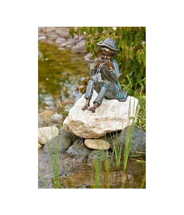 Man schließt den kleinen Til mit seiner Mundharmonika gleich ins Herz, so wie der Junge mit seinem hübschen Gesicht und den Locken unter dem Hütchen gut gelaunt auf dem Rosario-Findling sitzt und fröhlich musiziert! Die bezaubernde Rottenecker Bronzefigur zeugt von der Liebe des Künstlers zum feinen Detail wie von dem handwerklichen Können bei der Ausführung. Wenn dann noch leise das Wasser aus der Mundharmonika plätschert, wird die Rottenecker Bronzefigur Junge Til auf Rosariostein Ihren Gartenteich mit ihrem nostalgischen Flair verzaubern. Für die Wasserspeier-Funktion hat die Rottenecker Bronzefigur Junge Til mit Mundharmonika auf Rosario-Findling im Inneren eine Kupferrohr-Steigleitung. Die Bronzefigur Junge Til mit Mundharmonika auf Rosario-Findling ist frostfest, vor dem Wintereinbruch sollten Sie aber das Wasser aus der Leitung und dem Becken entfernen.