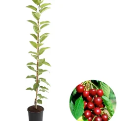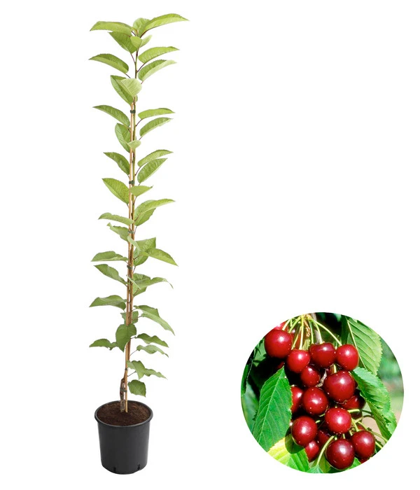 Ein aufrechter Wuchs, der sich bis in eine Höhe von 200-300 cm erstrecken kann, dabei aber schmal ist – Säulenobstbäume sind einfach genial für kleine Gärten. Sie brauchen nur wenig Platz, beschenken Sie aber reich mit hochwertigen, köstlichen Früchten. Wie diese Säulenkirsche, zwischen deren grünem Laub im Juli eine Fülle dunkelroter Kirschen locken, denen keine Naschkatze widerstehen kann. Doch auch im Frühjahr ist der Obstbaum eine Zierde, wenn er über und über mit weißen Blüten bedeckt ist, von denen Bienen und andere Nutzinsekten gerne naschen und dabei die Blüten bestäuben. Und auch wenn der Wuchs dieses Obstbaums von dem seiner großen Verwandten auf einer Streuobstwiese deutlich abweicht, handelt es sich trotzdem um eine hochwertige, sehr robuste Sorte, die sogar selbstbefruchtend ist. Gönnen Sie sich und Ihrer Familie ein ganz besonderes Naschvergnügen und holen Sie sich diese Säulenkirsche!