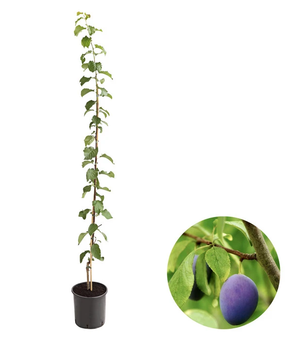 Säulenobst eignet sich ideal zur Haltung in Kübeln. So können Sie auch ohne einen großen Garten Ihr eignes Obst ernten. Die schlanke Wuchsform ist platzsparend und ein echter Blickfang in Ihrem Zuhause. Zwischen April und Mai bringt ‚Geisenheimer Top‘ ein weiteres Highlight mit sich. Eine Vielzahl an weißen Blüten ist dann zu bewundern. Natürlich sieht die Pflanze nicht nur schön aus, sondern bringt auch leckere Früchte mit. Die Zwetschgen sind stahlblau, rundlich und geschmacklich eine perfekte Mischung aus Süß und Sauer. Das Fruchtfleisch ist gelb und saftig, bei Überreife kann es allerdings etwas trocken werden. Die robuste Pflanze bringt sehr hohe Erträge ab Mitte September. Da die Zwetschgen eher spät reifen, sind sie auch für schwierige Lagen geeignet. Es handelt sich um einen Selbstbefruchter, weswegen keine zweite Pflanze zur Bestäubung benötigt wird.