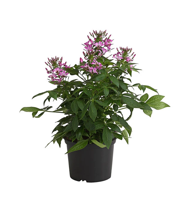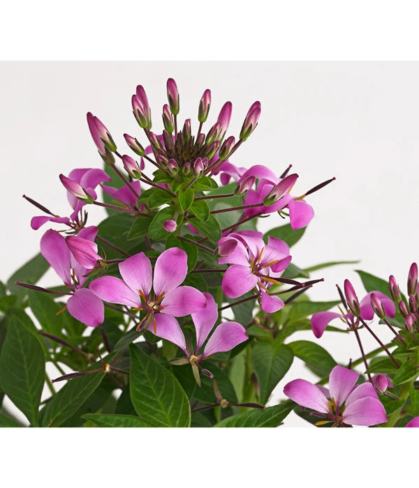 Lilarosa Blütenrispen und dekorative, moosgrüne Blätter machen die Spinnenblume ‚Rosa‘ zum Hingucker im Garten. Aufgrund ihrer spinnenartigen Einzelblüten, die sich aus lang gestielten Blüten- und Staubblättern zusammensetzen, trägt die Spinnenpflanze ihren Namen. Doch selbst mit diesem Namen hat sich die Gartenpflanze in die Herzen ihrer Besitzer geblüht. Denn Hobbygärtner schätzen ihren unermüdlichen Einsatz im Blumengarten – den ganzen Sommer über, bis zu den ersten Frösten im Herbst, trägt sie ihre rosavioletten Blüten über dem filigranem Laubwerk. Dank dem prächtigen, gut verzweigten Wuchs ist sie als Einzelpflanze im Topf schon eine auffällige Erscheinung, da sie bis zu einen Meter in die Höhe wachsen kann.