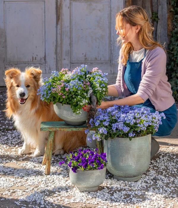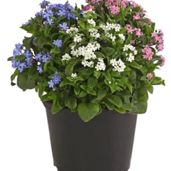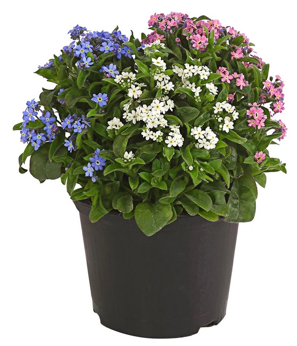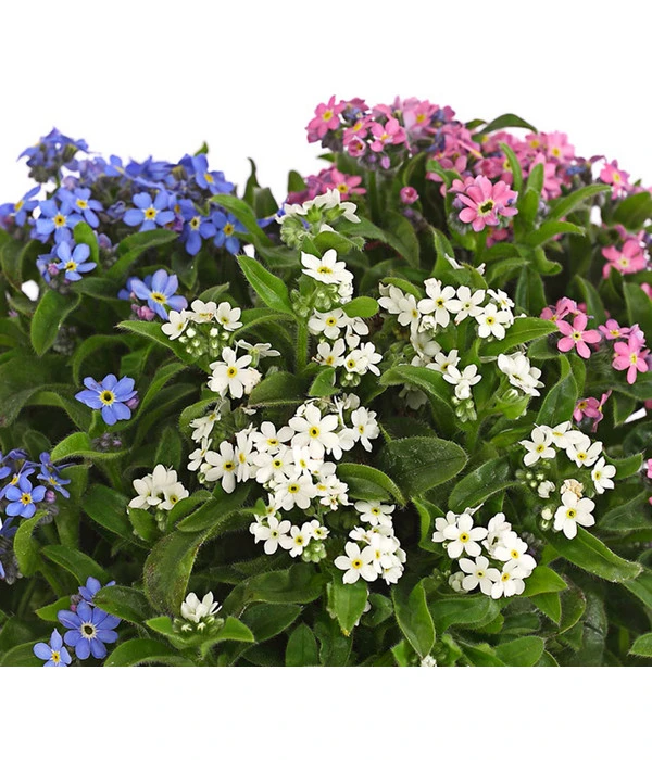Das auch in Europa beheimatete und sehr bekannte Vergissmeinnicht blüht reichlich und ausdauernd. Die kleinen Einzelblüten sitzen zahlreich auf den kompakt wachsenden Pflanzen und bilden einen schönen Kontrast zum dunkelgrünen Laub. Besonders dekorativ aber ist der Effekt, wenn sich das Vergissmeinnicht wie hier sogar mit drei Blütenfarben schmückt. Ausgepflanzt wirkt das Vergissmeinnicht besonders schön als Unterpflanzung von größeren Gehölzen. Aber auch in einer Frühlingsschale bezaubert die Pflanze mit ihrem besonderen Charme.