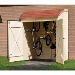 Damit sind Ihre Fahrräder oder Gartengeräte perfekt geschützt vor Wind und Wetter: Die Fahrradgarage von Weka ist ein optimales Schutzhäuschen für den Außenbereich. Sie sieht zudem sehr schön aus – das naturbelassene Holz des Häuschens wird von dem Bitumen-Dachbelag gegen Regen geschützt. Das 19 mm dicke Massivholz Dach überzeugt zusätzlich mit einer schönen Bogenform. Der Dachüberstand hinten beträgt 1,5 cm und seitlich 5 cm. Die Weka Fahrradgarage ist vorne 220 cm hoch und hat hinten eine Höhe von 180 cm. Ein besonderer Clou sind die Aufhänger für Ihre Fahrräder: Bis zu drei Räder können platzsparend eingehängt werden, somit haben Sie weiteren Platz für Gartengeräte usw. Die Weka Fahrradgarage wird in Bauelementen geliefert und lässt sich einfach montieren. Ohne Zubehör und Dekoration.