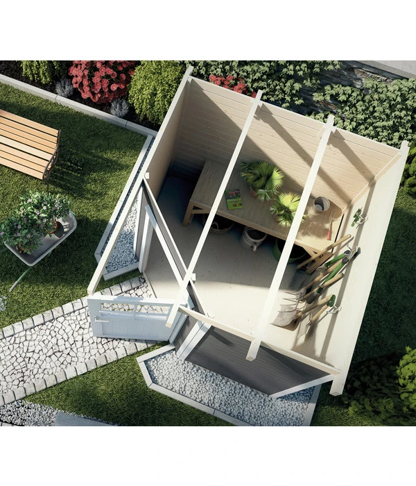 Für optimale Stabilität sorgen beim Gartenhaus 229 die 21 mm dicken Wandblockbohlen, der 16 mm starke Massivholzboden inkl. witterungsgeschützter Unterkonstruktion sowie das 16 mm starke Massivholz-Flachdach. Die Wandbohlen werden zusammen mit stabilen Eckpfosten verschraubt, so dass Ihnen auch der Aufbau leicht von der Hand gehen wird. Von außen schützen Deckleisten die Stirnkanten vor Witterung und sorgen für eine gepflegte Optik. Die breite Rahmen-Einzeltür mit einem Echtglas-Lichtausschnitt ergänzt die hervorragende Ausstattung, das Zylinderschloss mit 3 Schlössern schützt Ihre Gartengeräte vor Dieben.