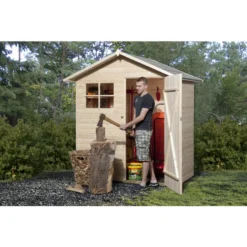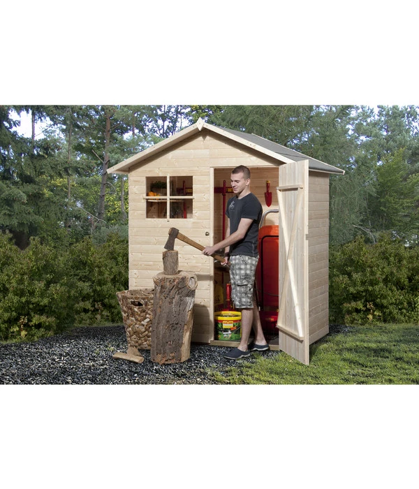 Gerätehaus in Elementbauweise, Natur, 14 mm Wandstärke, mit 16 mm starkem Spanplattendach, ohne Boden, mit kesseldruckimprägniertem (witterungsgeschützten) Bodenrahmen.
