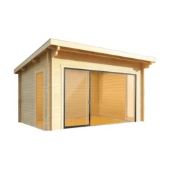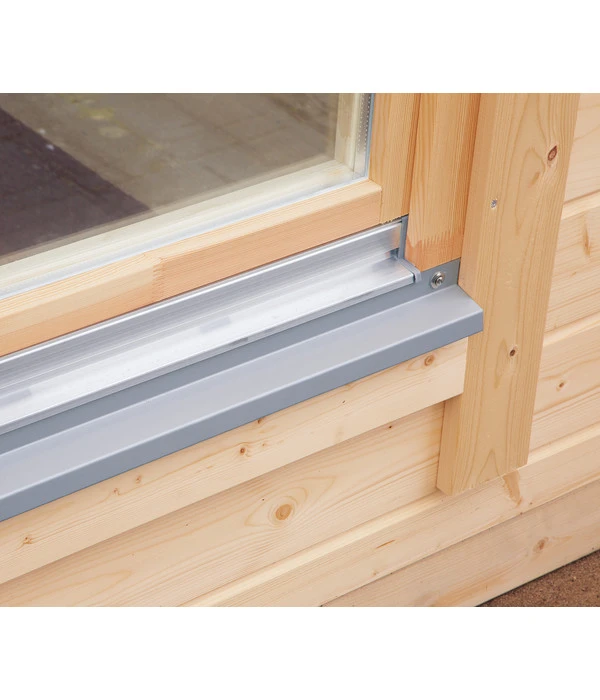 Wie Sie sicher auf den ersten Blick gesehen haben, besteht beim Wolff Finnhaus Gartenhaus Trondheim 70-F XL inkl. Schiebetür rechts die Vorderfront nahezu vollständig aus Türelementen, die sich zusammenschieben lassen, sodass in geöffnetem Zustand keine störenden Türflügel im Wege sind. Darüber hinaus hat das Haus zwei bodentiefe Fenster in den Seitenwänden, sodass viel Tageslicht ins Innere des Hauses fallen kann. Die Glaselemente in der Tür sind aus Sicherheitsglas, die Seitenfenster aus Isolierglas; die Fenster sind zusätzlich mit einem Einhand-Dreh-/Kipp-Beschlag ausgestattet.